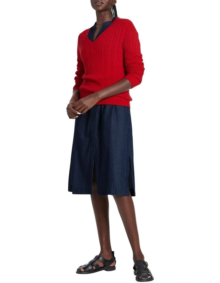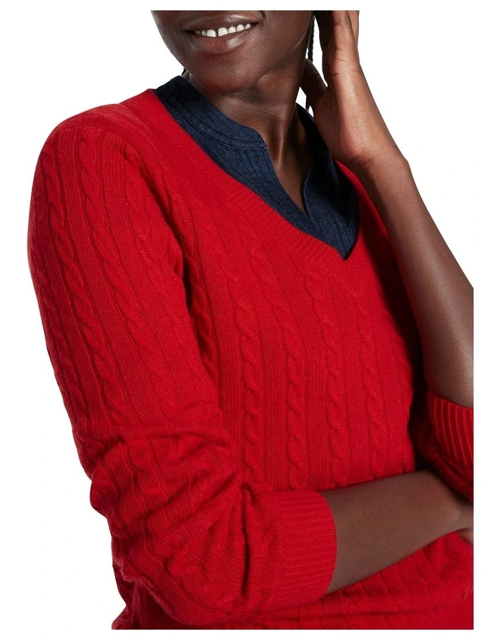 Endlessly wearable, this long sleeve, regular fit knit sweater will become a go-to piece in your autumn-winter wardrobe. Vibrant scarlet in colour, the sweater is made from a soft blend containing cotton, lambswool and cashmere in a mid-weight yarn, knitted to reveal cable knit detailing throughout, accentuated with rib trim at the deep V-neckline, cuffs and body hem.Β