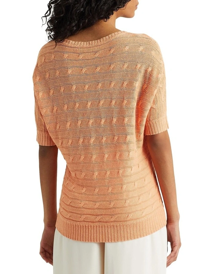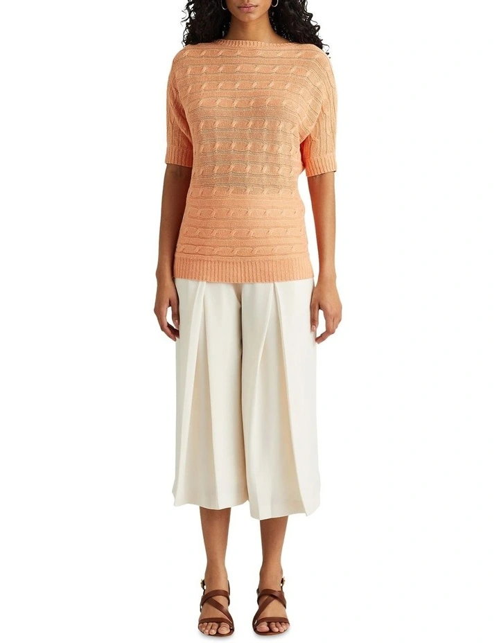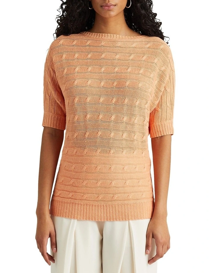 Lightweight linen updates the essential cable-knit sweater for the season, which is designed with a boatneck and dolman sleeves for a relaxed silhouette.