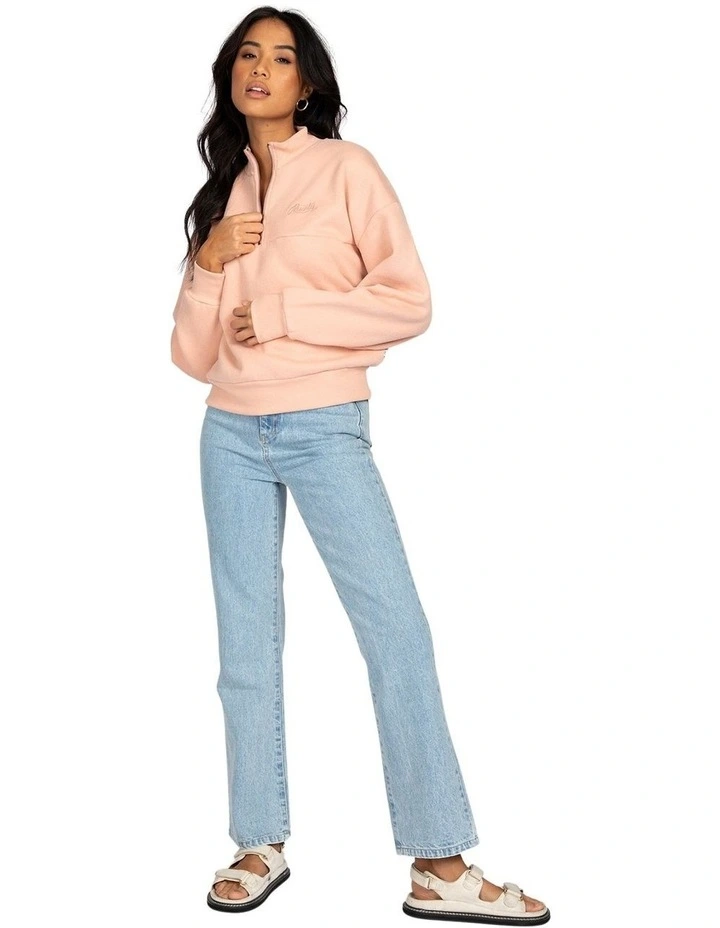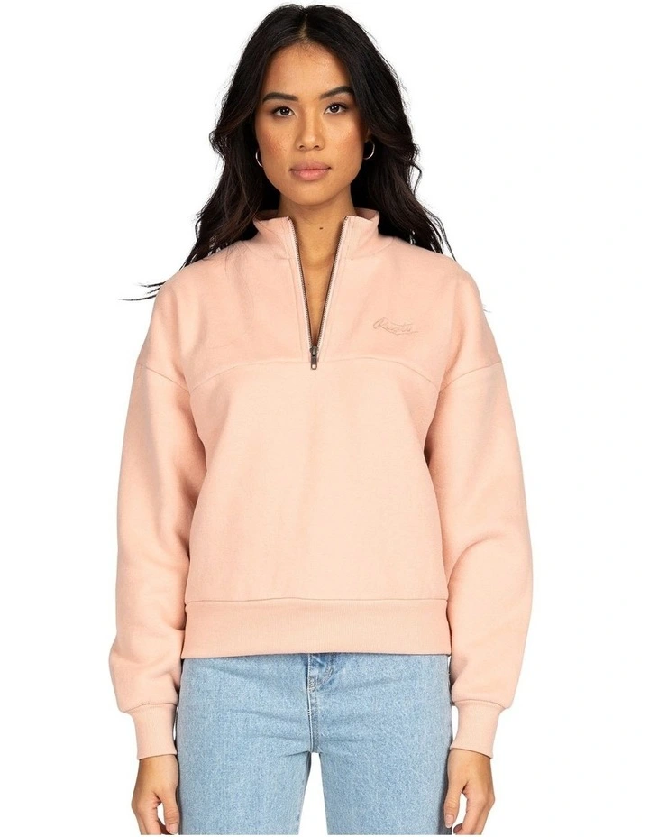 The Rusty Script Relaxed 1/2 Zip Fleece is a relaxed fit fleece with mock neck, half zipper and Rusty embroidery.